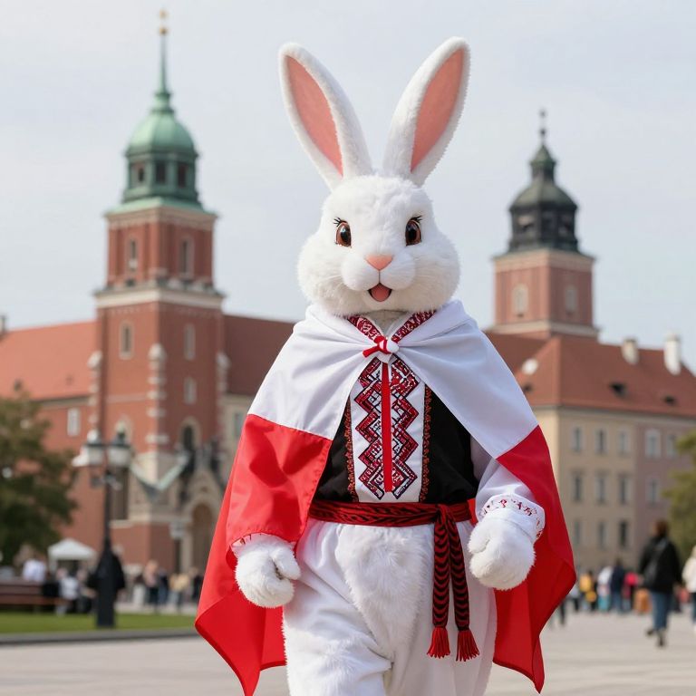 Mysterious the most epic easter bunny dressed in a polish flag with the city of Warsaw in the background. Traditional Lowicki clothing. Poland,