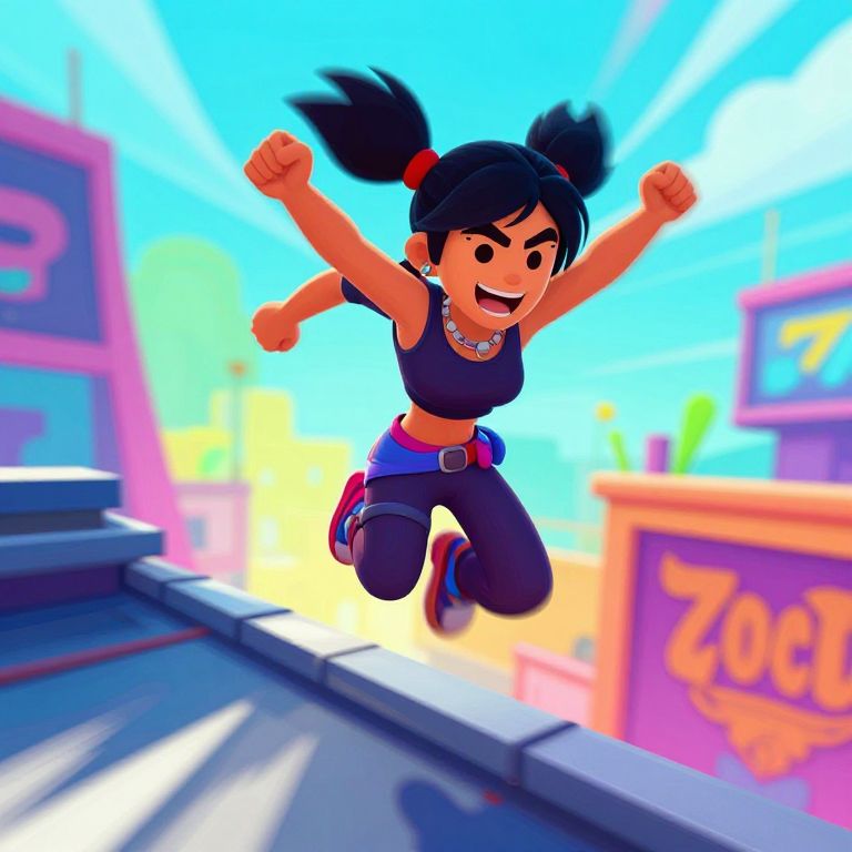 Fortnite character with pigtails jumping from rooftop, energetic expression, colorful street art backdrop, stylized cartoon style, bold outlines, fast motion blur
