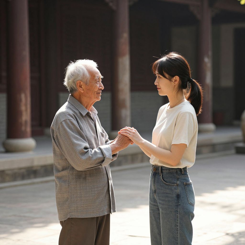 Photograph of an elderly East Asian man with white hair and glasses, wearing a gray checkered shirt and dark pants, standing and holding hands with a young East Asian woman with black hair in a ponytail, wearing a white short-sleeve top and high-waisted blue jeans. They are outdoors, standing on a sunlit stone pavement with a background of dark, columned architecture. The elderly man looks at the woman with a gentle smile, while she looks back at him, smiling. The lighting creates a bright, contrasting effect, highlighting their faces and hands.