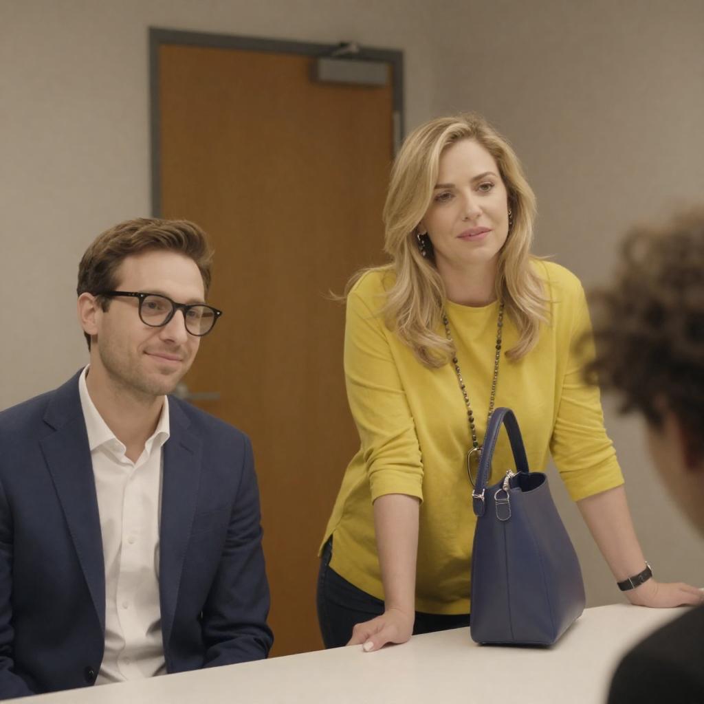 Photograph of two people sitting at a table. Blonde woman with wavy hair, gray blazer, white shirt, blue scarf, gesturing with her right hand. Brown-haired man in blue suit, light blue shirt, striped tie, arms crossed, looking at her. Background includes blurred people, Christmas tree, and red bag. Coffee cup and tablet on table. Woman on left with back to camera, yellow top. Casual indoor setting. Woman smiling, man neutral.