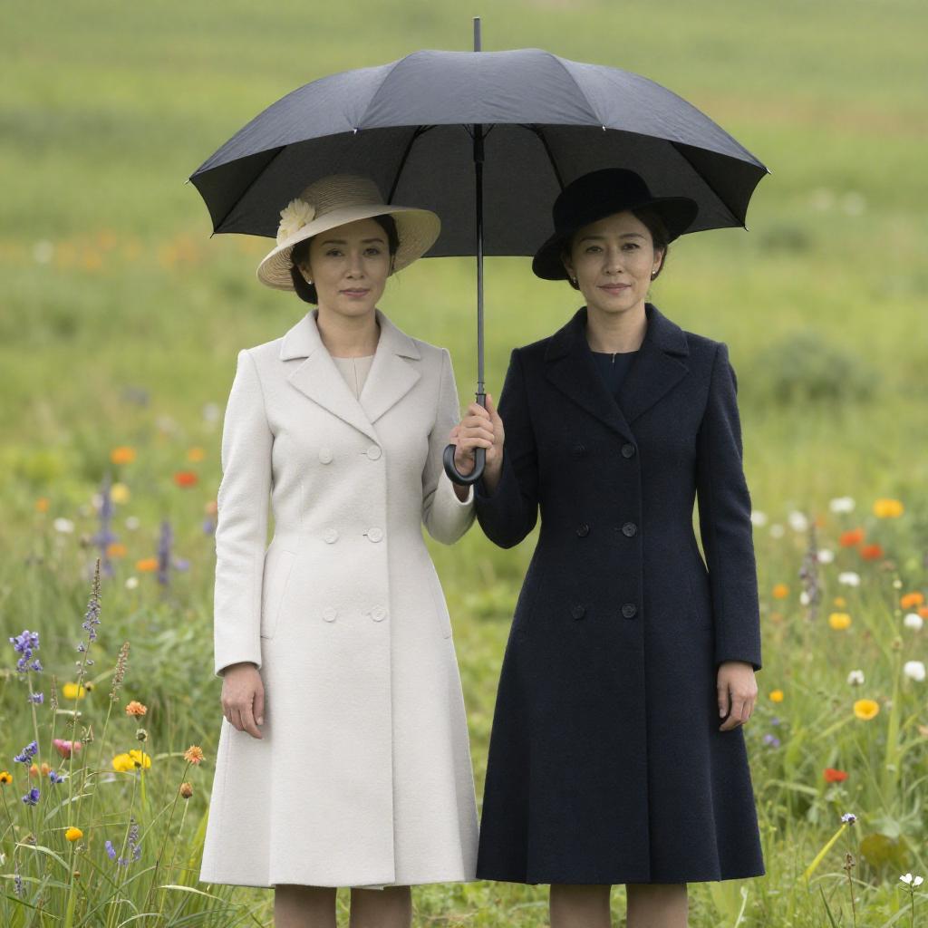 Photograph of two women in a grassy field with flowers. Both wear hats and formal attire; one holds a black umbrella. The woman on the left wears a light-colored coat, the woman on the right a dark coat. They stand side by side, facing forward, surrounded by tall grass and colorful wildflowers. The woman holding the umbrella has a slight smile.