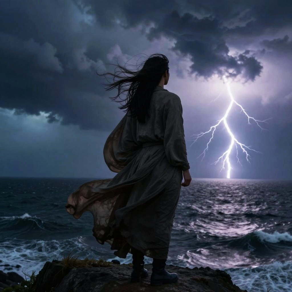 Gyatsu standing on a cliff overlooking a vast ocean under a stormy sky, wind blowing the loose robes dramatically, detailed wind-swept hair, dark storm clouds contrasting with bright lightning, cinematic fantasy style, high detail and texture.