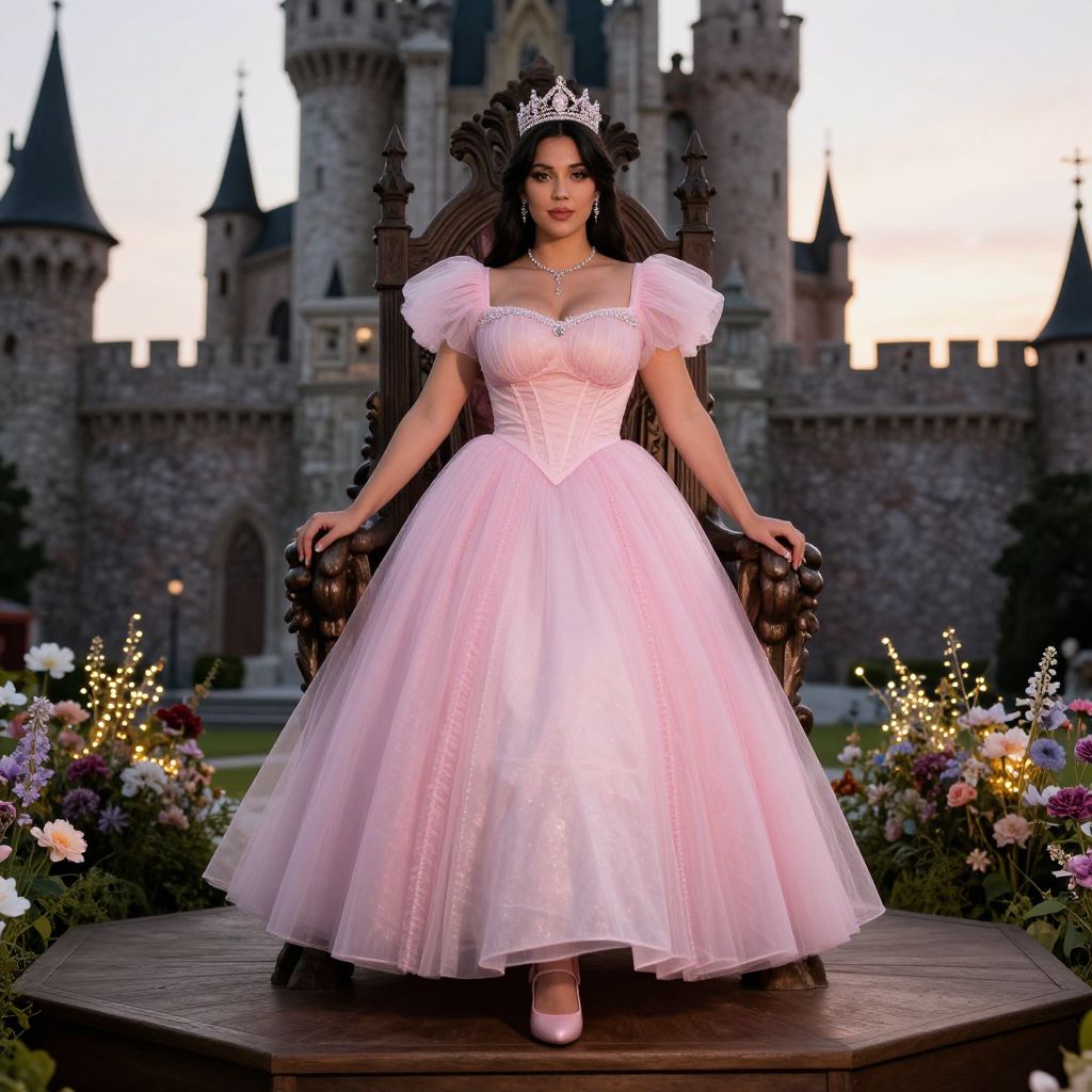 A striking woman with a sharp nose, high cheekbones, and deep brown eyes dressed in a full-length pink queen dress with a sheer bodice and a corona of tulle, stepping confidently on a wooden throne platform in a gothic castle courtyard at sunset, surrounded by flowers and fairy lights.. The woman has big tits and cute face