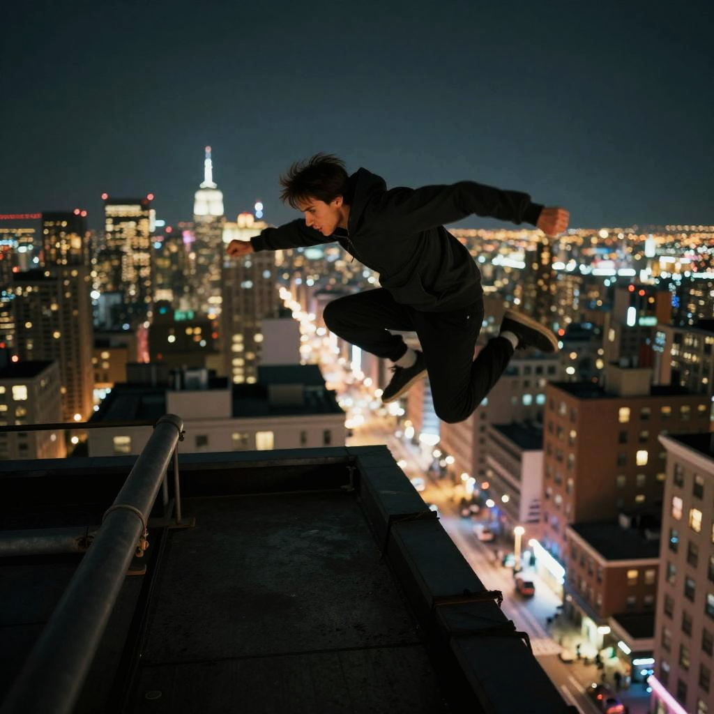 Urban Rooftop Parkour Night Scene
