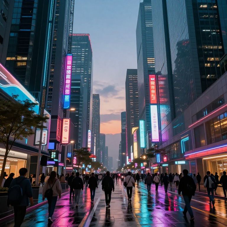 Photograph of a bustling urban street at dusk in a modern city, with reflective wet pavement. Tall, dark glass skyscrapers line both sides, adorned with vibrant neon signs in pink, blue, and white. Crowds of people, dressed in dark and light clothing, walk along the street. The sky is a gradient of blue to pink. The neon lights cast colorful reflections on the pavement. Trees are visible on the left, and storefronts are illuminated with bright lights. The scene is lively and energetic, capturing the essence of a vibrant city nightlife.