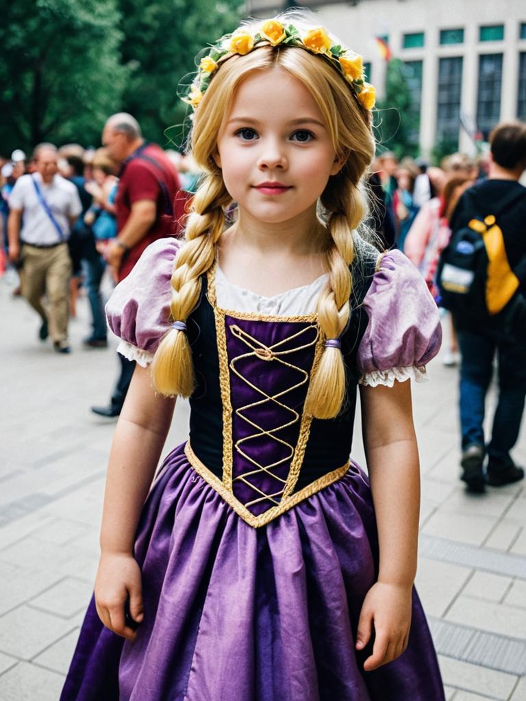 Child in Rapunzel Costume, cosplay festival photo, photorealistic realism