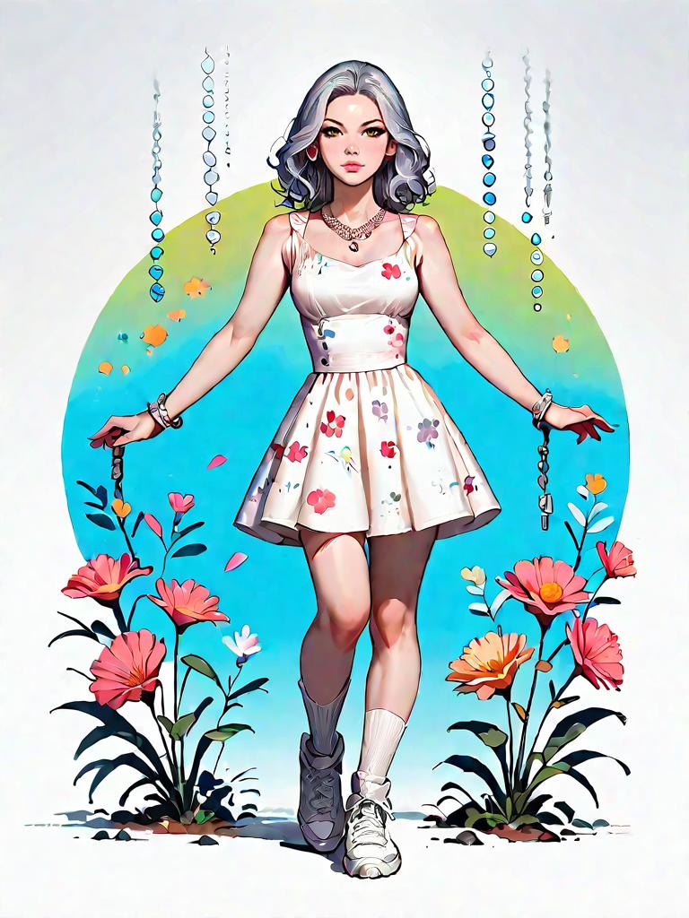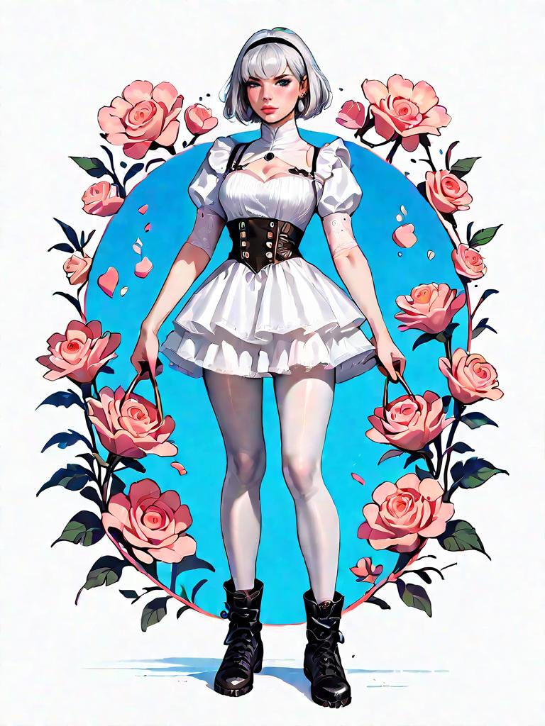 1girl, source_comics, realistic face, full body shot, Woman, contemporary street style, black velvet mini dress with a sweetheart neckline and short puff sleeves, sheer tights with floral pattern, black lace-up combat boots with a chunky sole, holding a small silver sequined purse, white studio background.