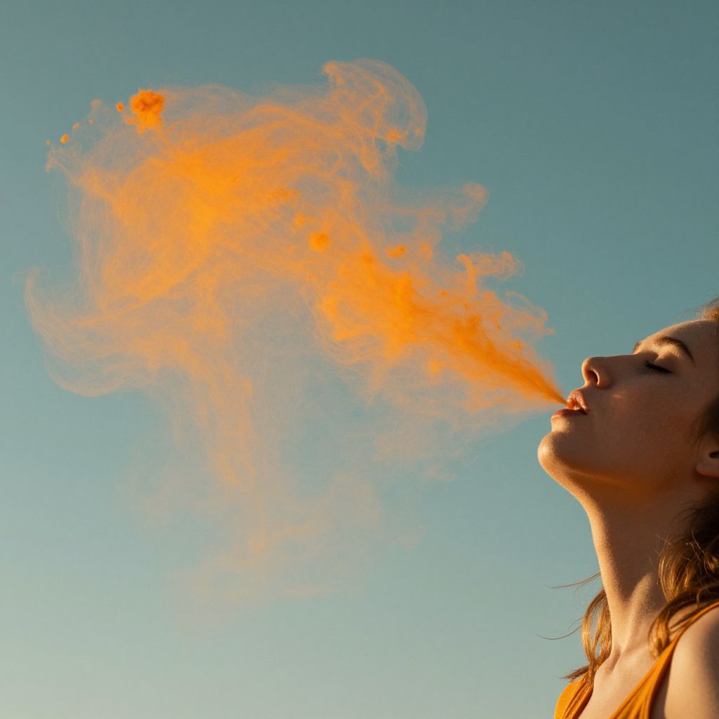 Woman exhales vibrant orange particles that cascade gracefully into the air, creating a dynamic stream of light and color against a serene teal backdrop.