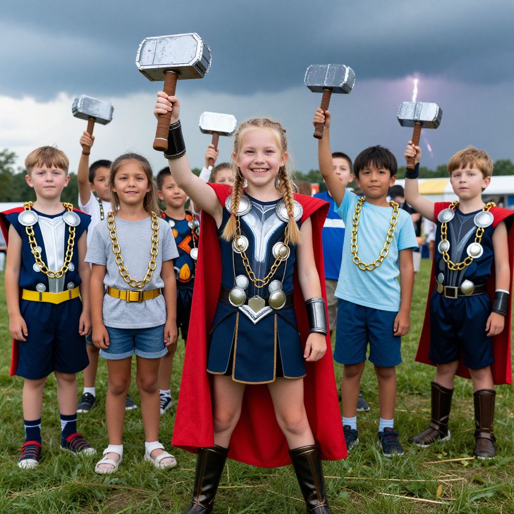 A diverse group of kids at a summer camp event, all wearing their own versions of the Thor costume with handmade details like golden chains and mini hammers, one girl with braided hair and a wide smile, standing under a blue sky with a thunderstorm in the distance, celebrating in full costume.