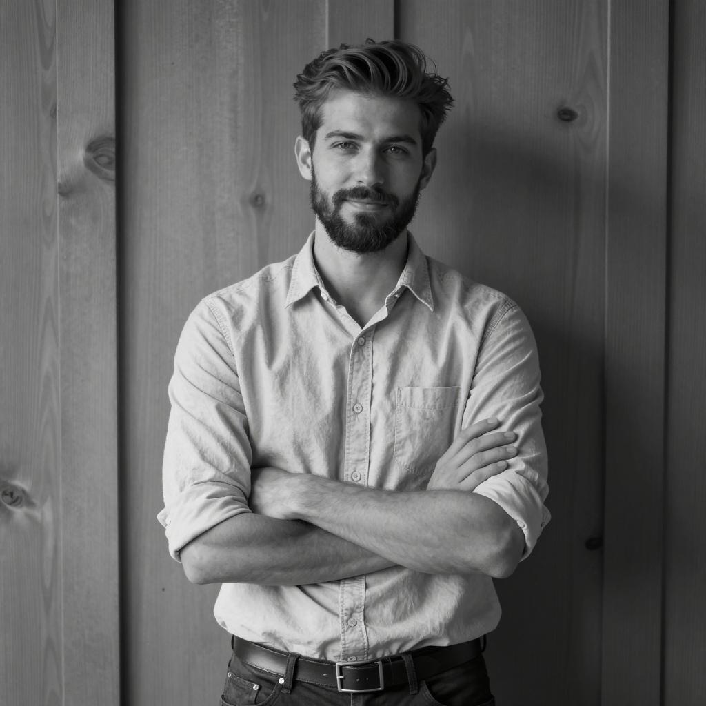 Black-and-white photo of a handsome, bearded man with short, neatly styled hair, standing against a wooden wall. He's wearing a light-colored, button-up shirt with sleeves rolled up, and dark pants. His arms are crossed, and he's smiling slightly. The lighting is natural, coming from the left, creating soft shadows. The camera angle is straight-on, and the background is in focus, showing the wooden texture clearly. Depth of field is moderate, keeping both subject and background sharp.