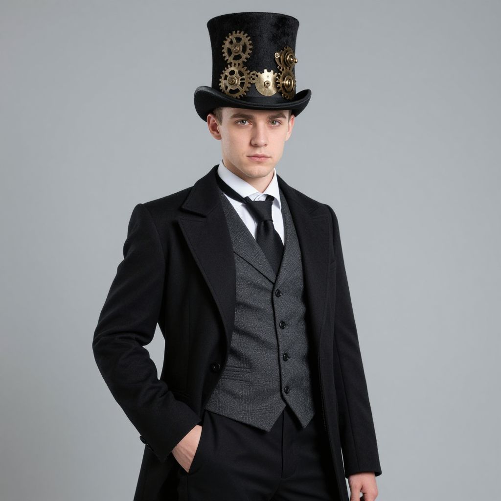 Young man with pale skin in black Victorian-style suit, gray vest, black tie, and top hat adorned with gold gears. Hands in pockets, neutral