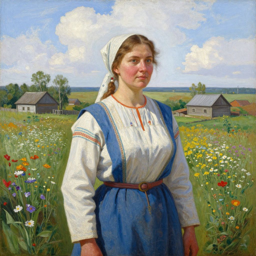 A Soviet Ukrainian oil painting by Vladimir Patyk, depicting a peasant woman from Rusov in 1971, rendered in vivid realism with a serene rural backdrop featuring blooming wildflowers and scattered cottages under a bright, cloud-filled sky.