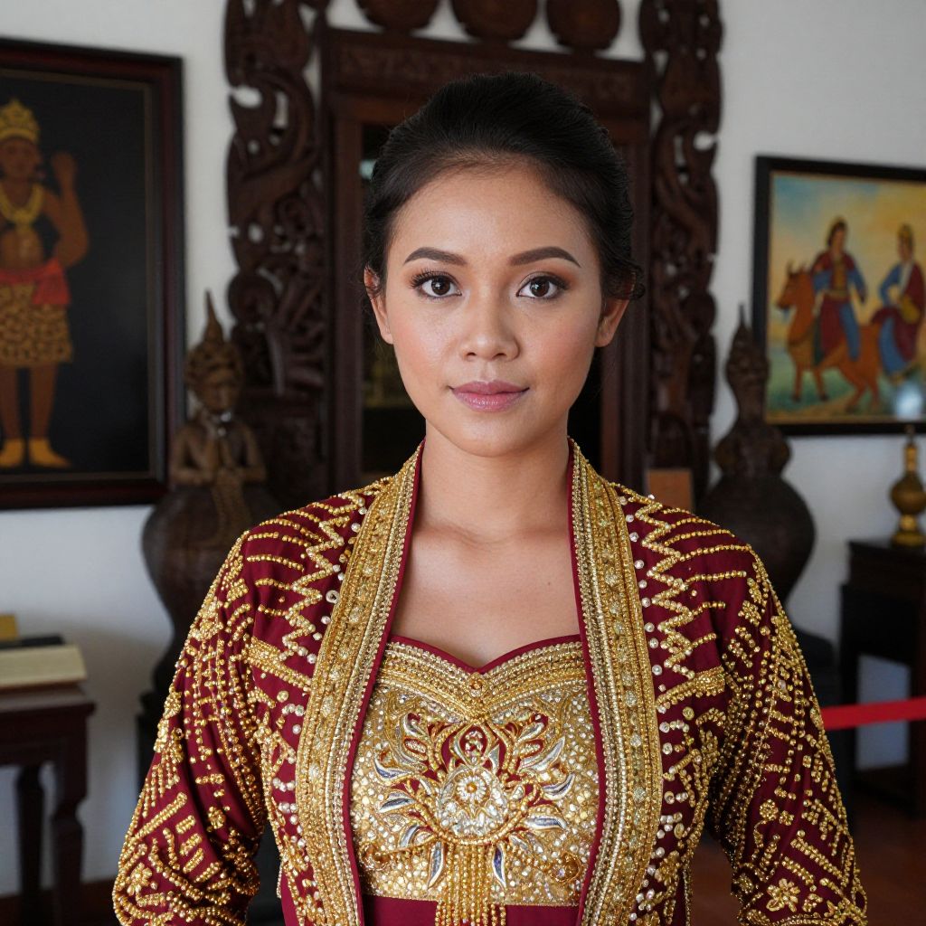 A strong, confident Kadazan woman in full traditional costume — a red and gold ceremonial dress with intricate beadwork and a hand-embroidered bodice, standing in front of a heritage museum in Sabah, with a backdrop of old wooden carvings and local art displays, detailed facial features including deep brown eyes, high cheekbones, and a serene look, professional photography with natural lighting. The woman has big tits and cute face