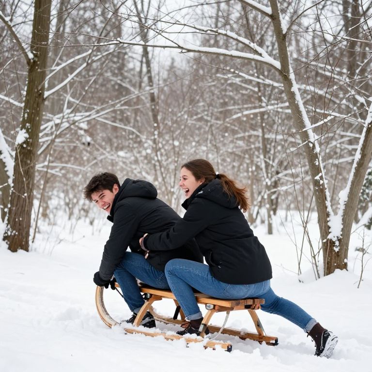A lively photograph of two people laughing and playfully pushing each other on a small wooden sled in a snowy forest. Both wear black jackets and blue jeans, with the person on the left having short dark hair and the one on the right with long brown hair tied back. Bare trees with snow-covered branches frame the bright, wintry background.