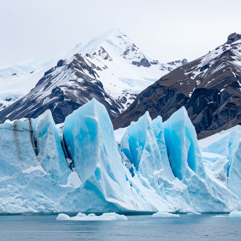 Vast turquoise ice formations stand majestically against a backdrop of rugged, snow-capped mountains, their jagged edges reflecting the serene yet powerful presence of nature's icy embrace.
