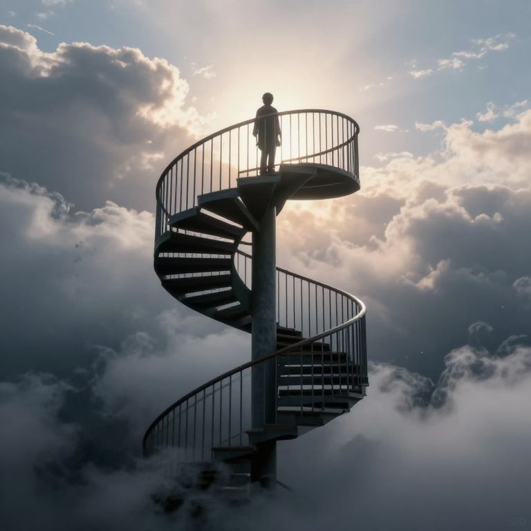 Spiraling staircase ascends gracefully through a surreal sky, its iron balustrade twisting amidst swirling clouds and dark smoke, as a solitary figure stands at the top, silhouetted against the radiant horizon.