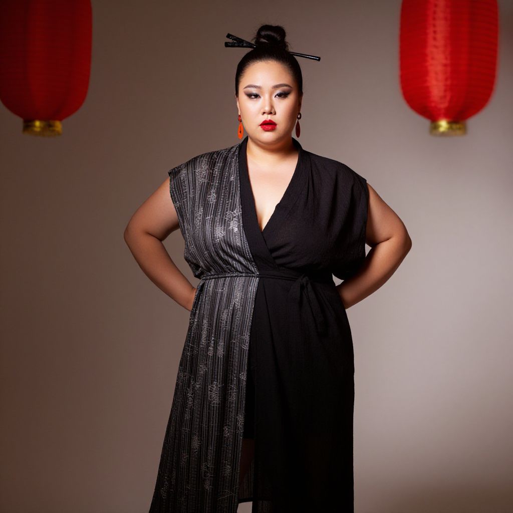 Bbwchinese confident plus-size model posing in contemporary fashion inspired by Chinese culture, bold makeup and hairstyle, minimalistic background with delicate red lantern shadows, high contrast visuals