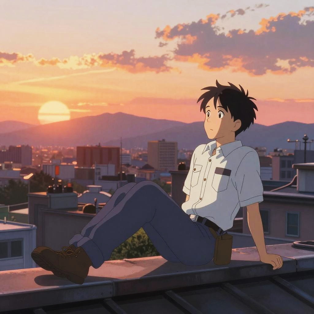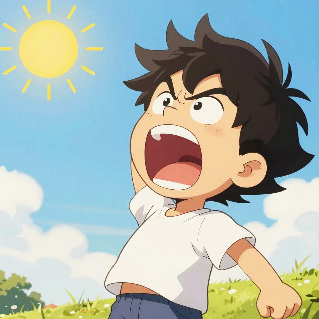 Anime smile with teeth, dynamic and lively character posing amidst a bustling cityscape at sunset, vibrant colors with warm orange and pink hues, detailed eyes full of excitement, hair strands animated by the wind, energetic and uplifting scene.