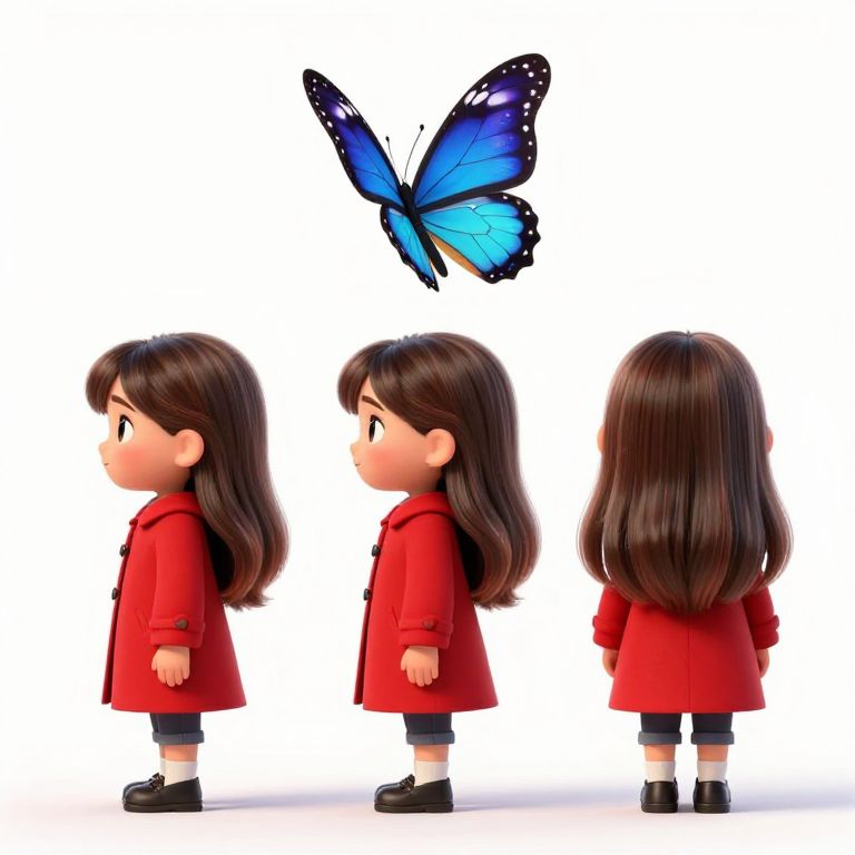 Butterfly cute 7 year old girl, with long brown hair, 3 poses from side front and back, wearing a red coat, Pixar Style,