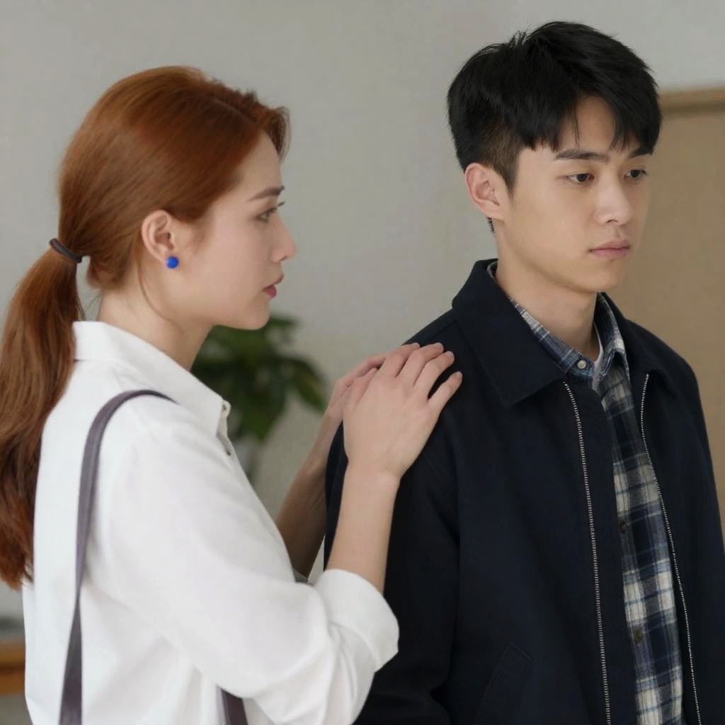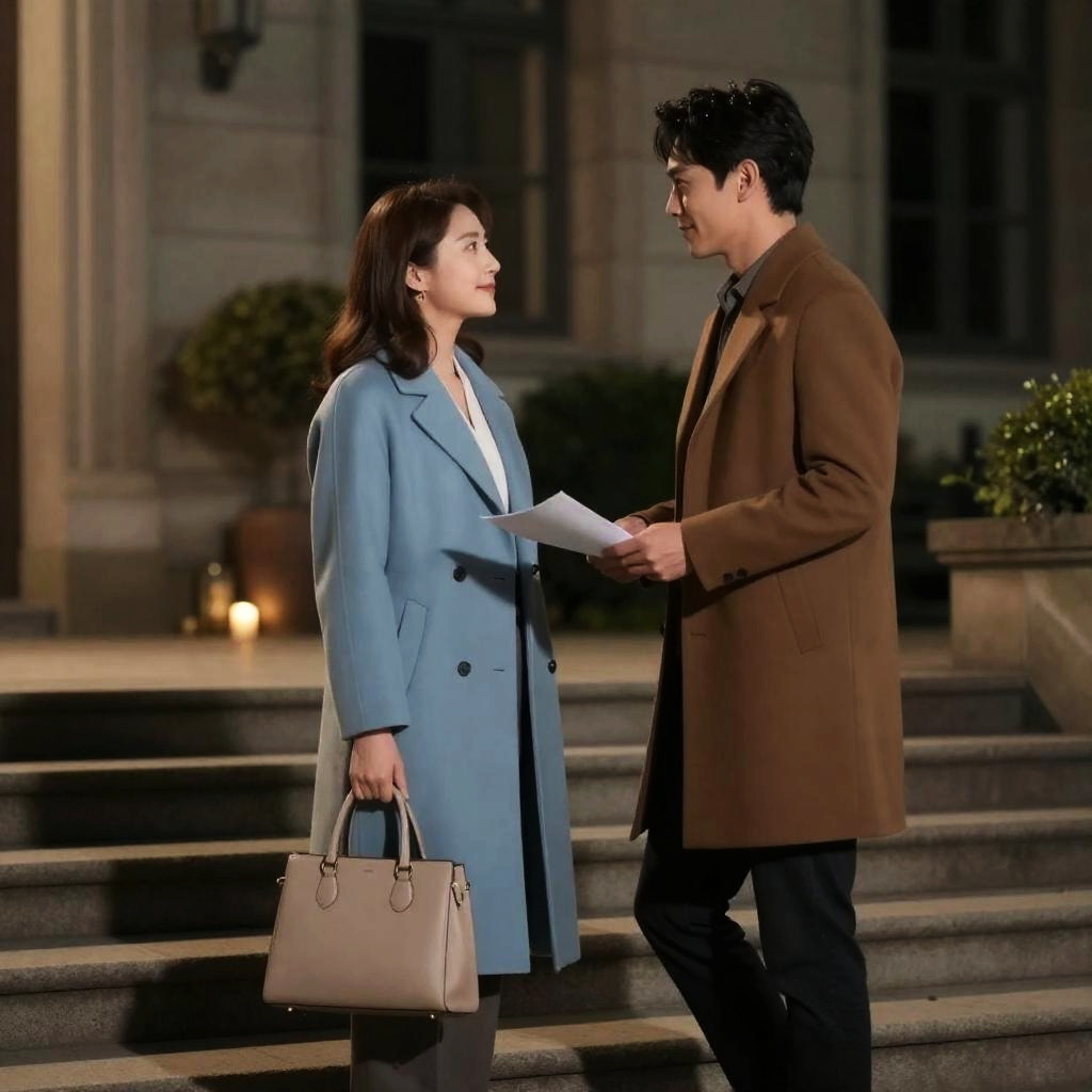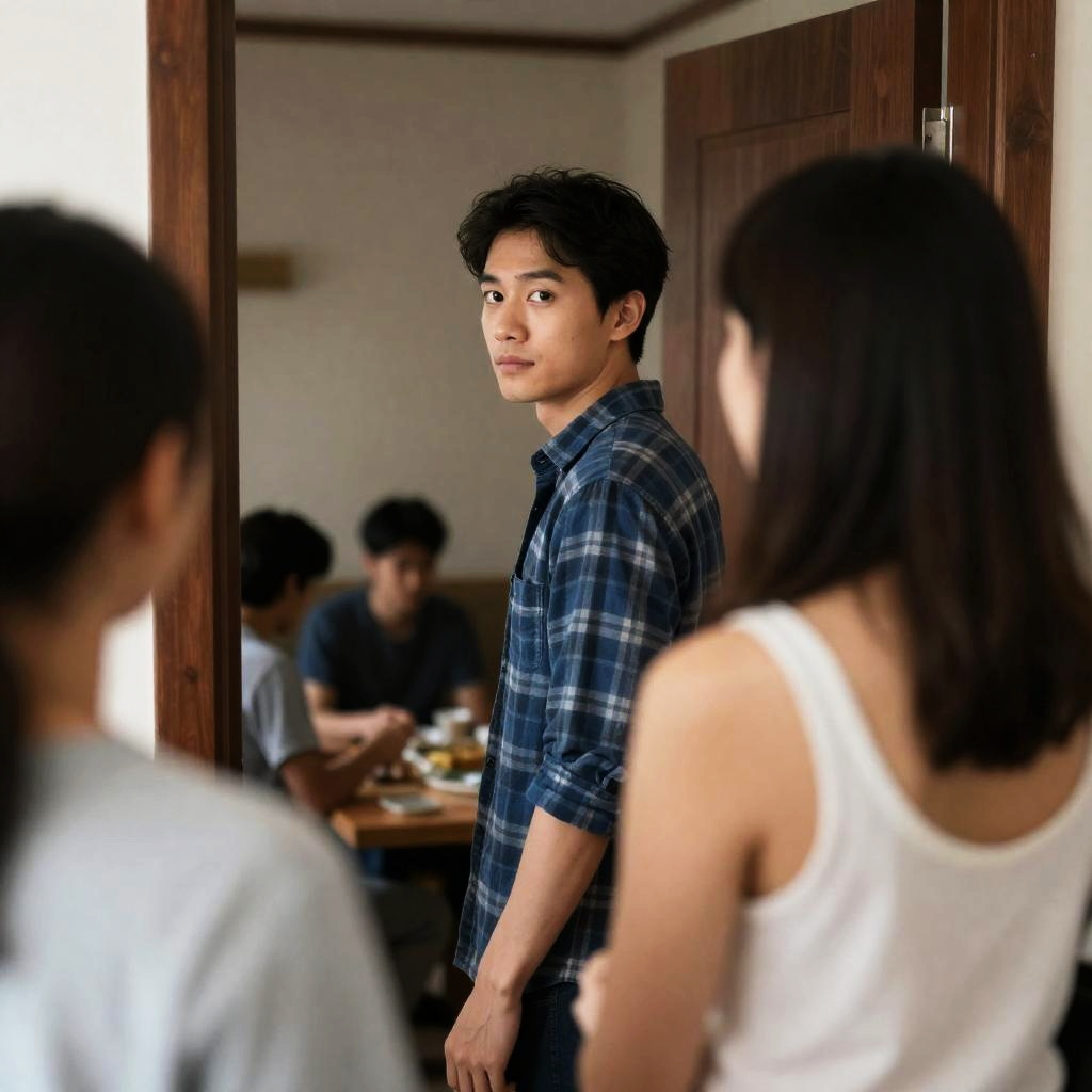 Photograph of a woman with long dark hair in a plaid coat taking a photo of a man with short black hair in a blue shirt and gray coat. Background includes holiday decorations, boxes, and a folding screen. Man stands slightly right, woman on the left, holding a camera to her face. Both have neutral expressions. Indoor setting.