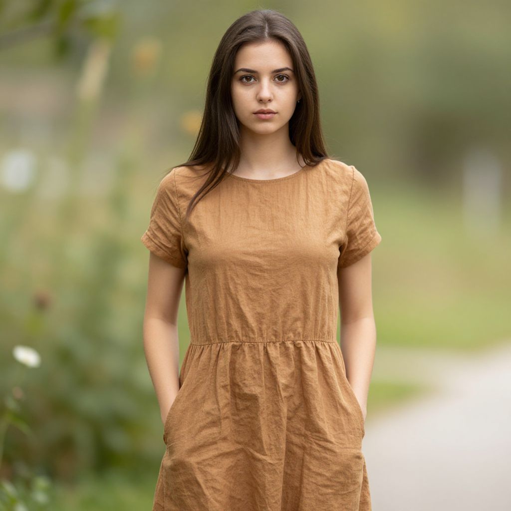 Photograph of a young South Asian woman with medium brown skin and long, straight black hair standing outdoors on a blurred, green, and grassy path. She wears a simple, short-sleeved, knee-length, rust-colored dress with a round neckline and her hands are in her dress pockets. Her expression is neutral, with slightly parted lips and dark, focused eyes. The background is softly out of focus, featuring greenery and a hint of a white flower on the left. The image has a natural, soft-light setting, enhancing the earthy tones of her dress and the surrounding foliage.