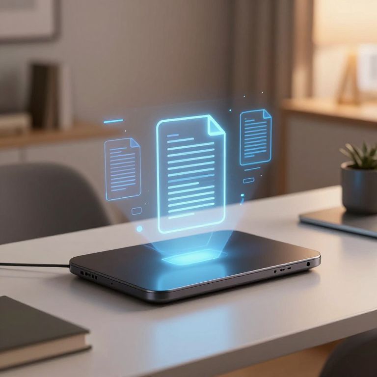 Photograph of a black laptop on a white desk, emitting blue holographic documents, in a softly lit, modern office.