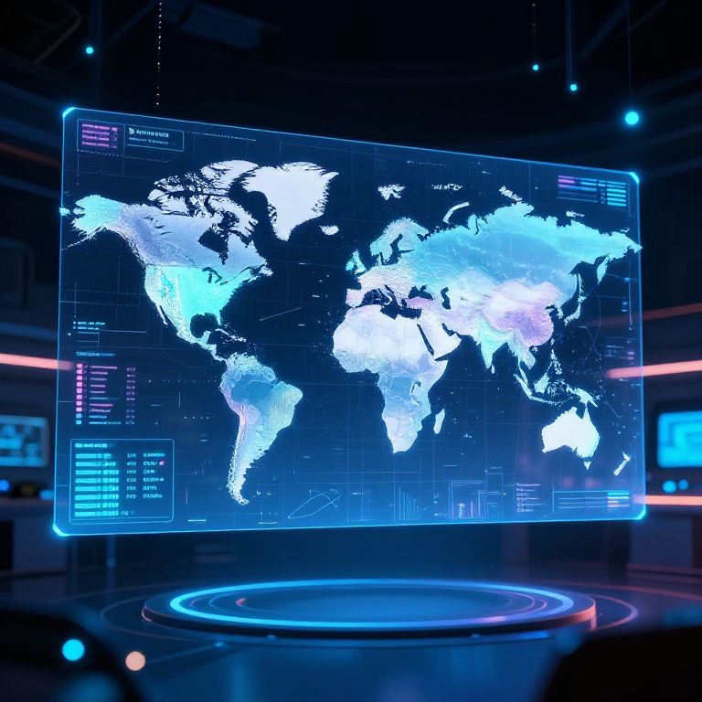 World maps AI visualization, large transparent holographic map floating in a sci-fi control center, showing realtime data streams and AI-driven analytics, surrounded by futuristic user interfaces and glowing data nodes, in vibrant neon colors with deep contrast.