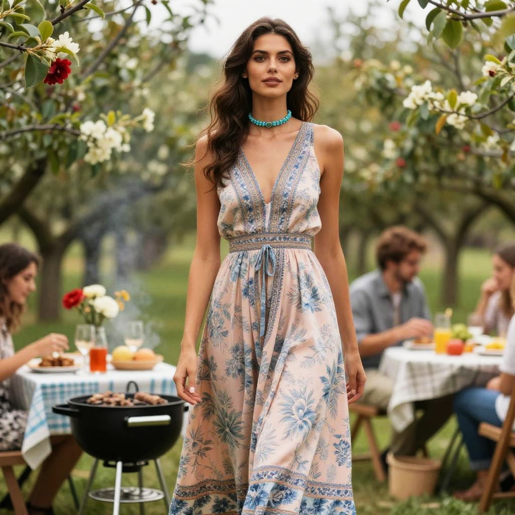 A toned woman in a bohemian chic sleeveless peach dress with a floral print, relaxed fit, and delicate gold accessories, standing in a botanical garden café surrounded by lush greenery and vibrant flowers, visual style: dark horse. Sexy. Pretty face and beutiful eyes
