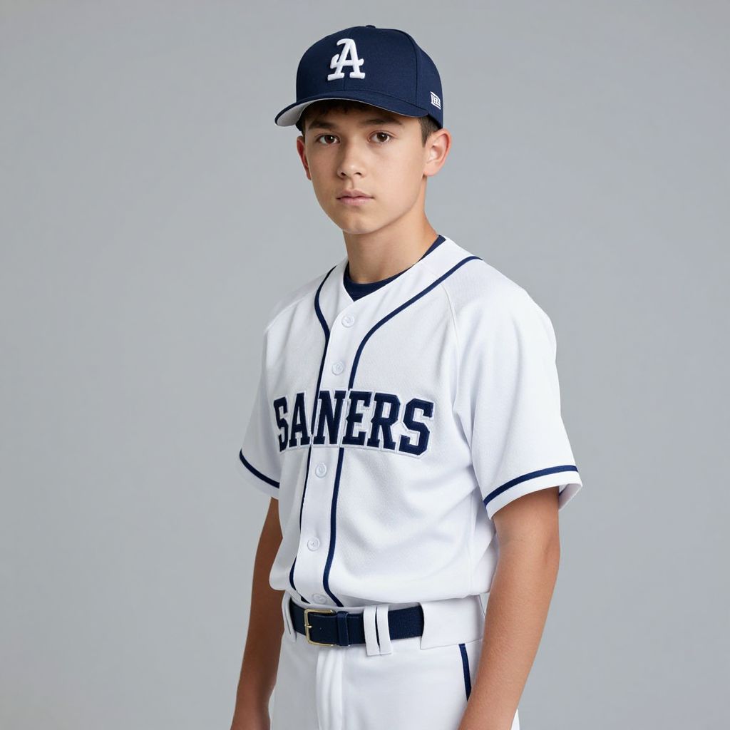 Baseball costume man, 1boy, male focus, solo, sportswear, realistic, hat, baseball uniform, baseball cap, grey background, looking at viewer, shirt