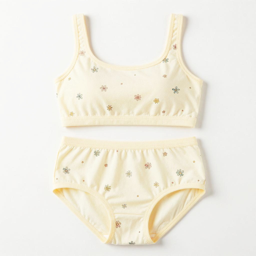 12 year old bra, children's underwear with gentle elastic bands, subtle prints, soft fabric, warm and cozy ambiance, detailed fabric texture, studio photography