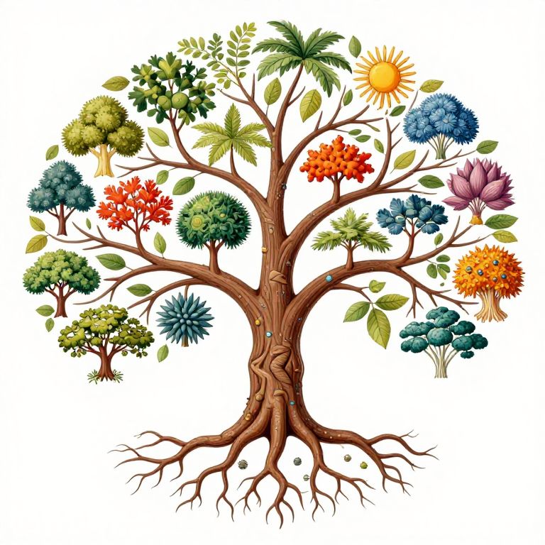 Taxonomy concept illustrated as an intricate tree with colorful branches and roots, each branch representing different categories of life, highly detailed, botanical style, vibrant colors, scientific yet artistic interpretation