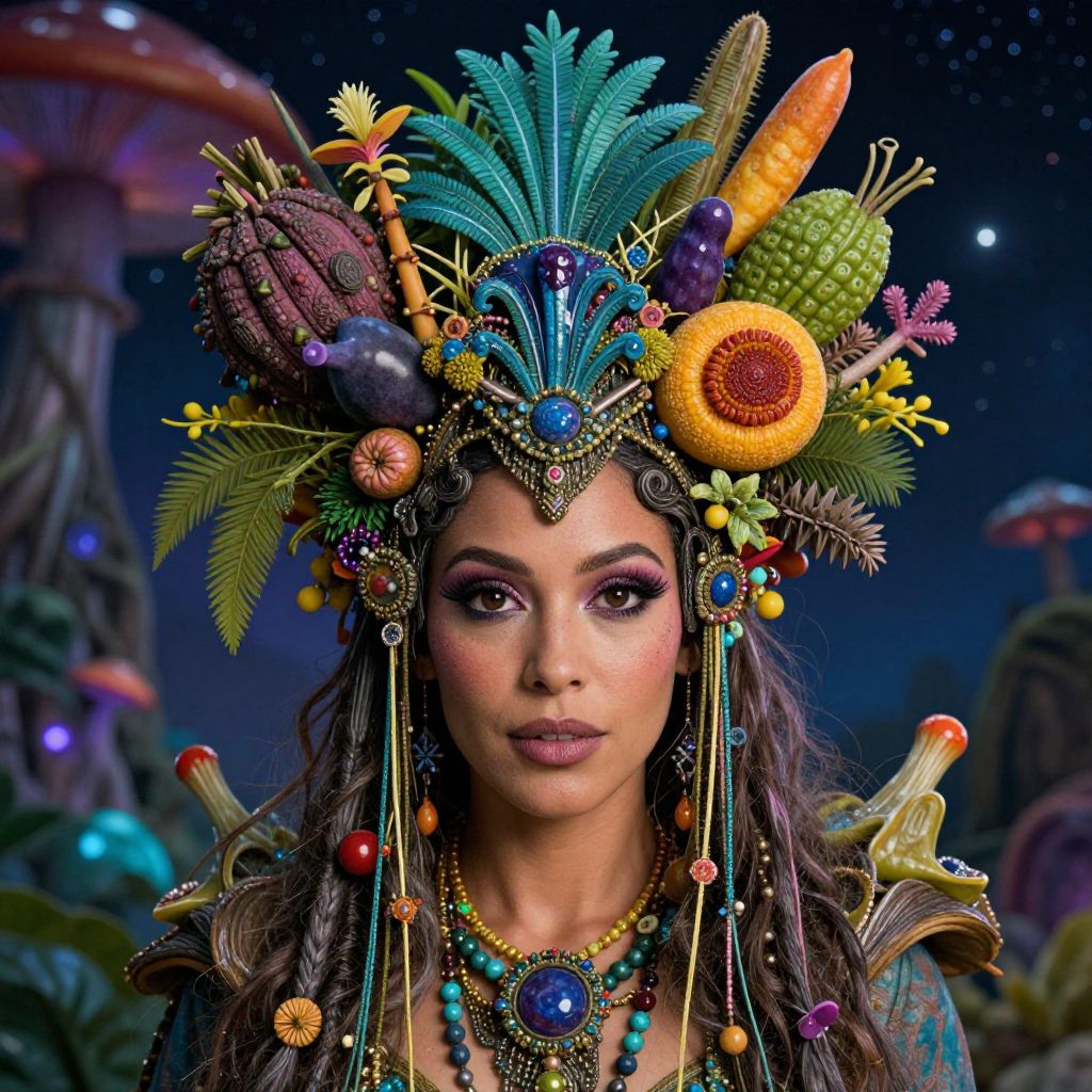 Fantastical digital portrait of a woman with colorful, intricate headdress adorned with fruits, feathers, and beads, set against a starry, mushroom