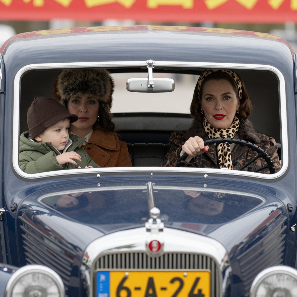 Photograph of a vintage car with three people inside. Driver, a woman with red lipstick, leopard print scarf, and matching headband, holds the steering wheel. Passenger, a woman in a brown coat and fur hat, looks forward. Child in green coat and brown hat sits in back. Car has dark blue exterior, yellow license plate "6-A-24", and red banner on roof.