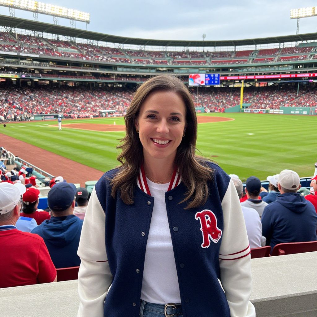 Smiling woman wearing a Boston Red Sox jacket stands in the foreground of Fenway Park, Boston, Massachusetts, with a vibrant crowd and baseball field visible behind her.