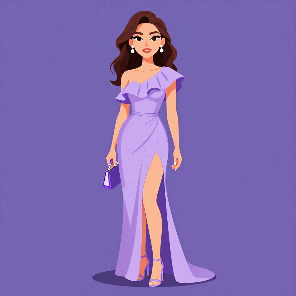 Woman with pretty face and pretty hair. Asymmetrical cut-out maxi dress, lightweight jersey fabric, lavender, one-shoulder design, cascading ruffles, fitted bodice, flowing train, matching clutch, pearl drop earrings, metallic block heels. --sref 1461