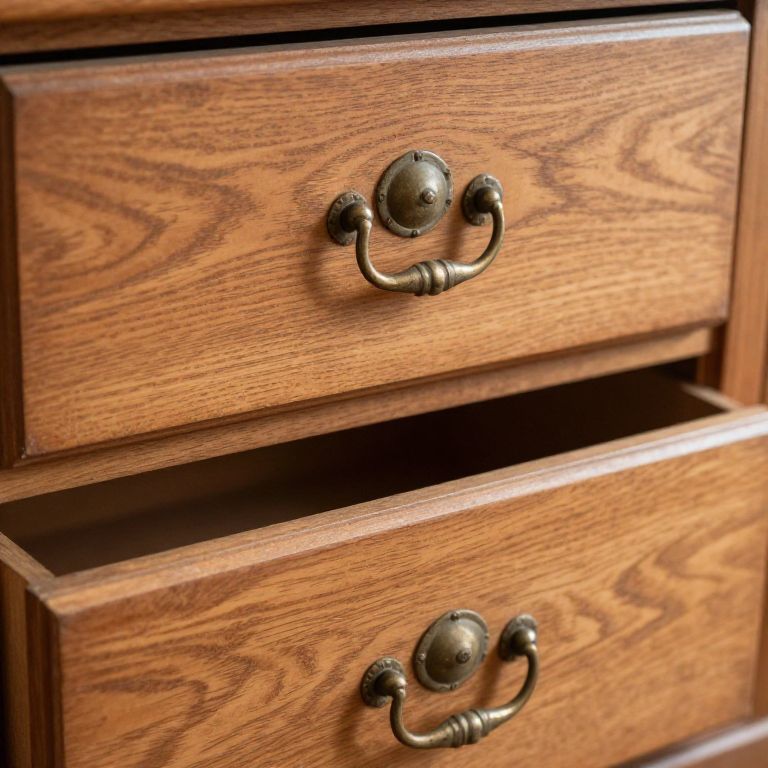 Close-up art of drawers showcasing highly detailed textures of wood grains, ornate metal handles, and subtle signs of wear, with soft natural sunlight highlighting craftsmanship, emphasizing the beauty and heritage of functional art.