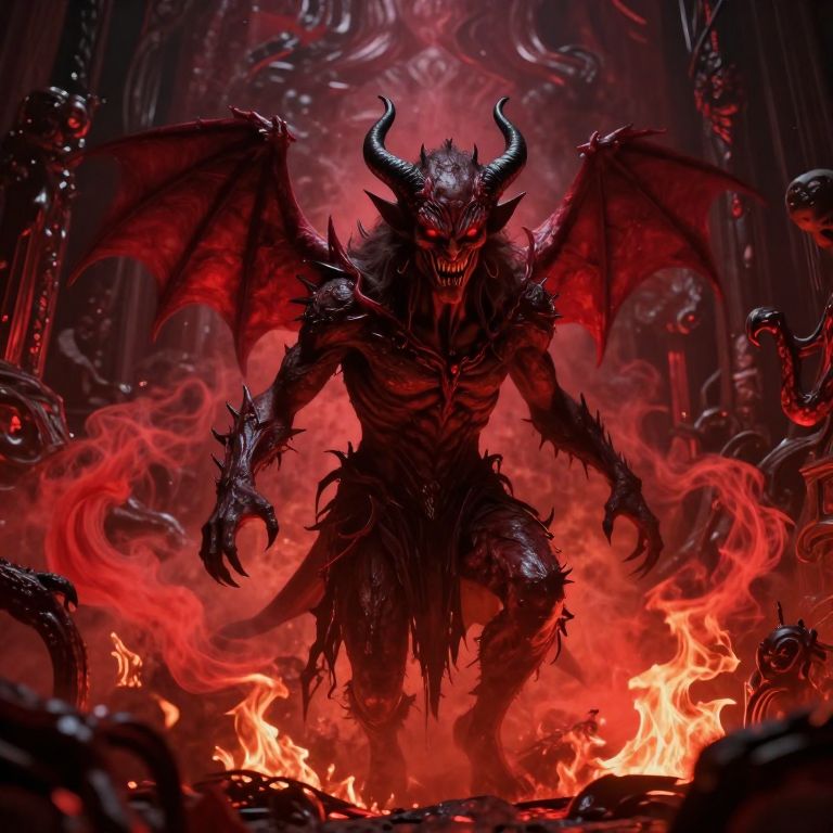 A dark, mischievous demon creature emerges from a swirling red smoke, surrounded by a detailed, fantastical background filled with magic and fire.
