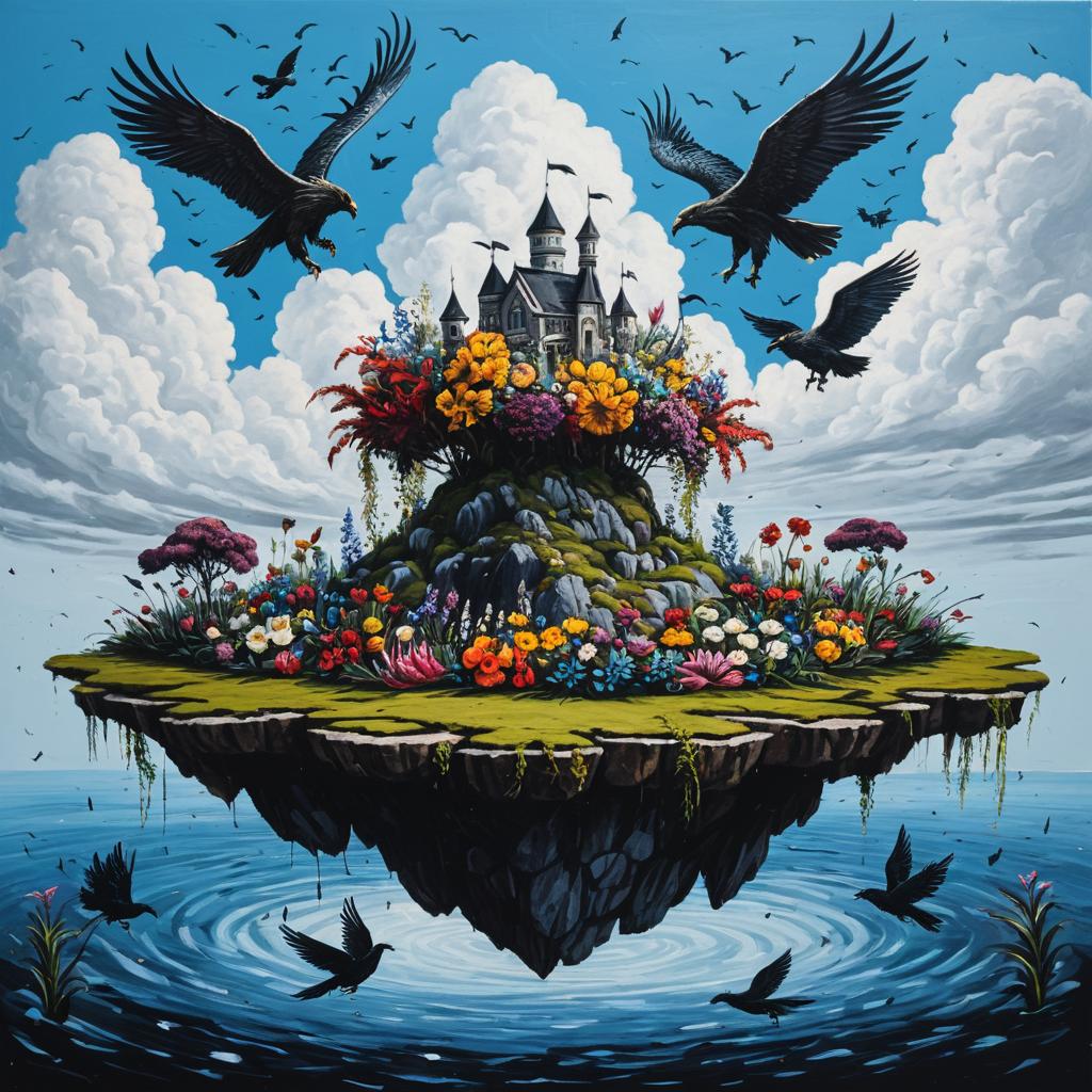 A surreal acrylic painting depicting a floating island surrounded by water, featuring a lush green landscape with colorful flowers and a large tree at the center. Several griffins, mythical creatures with the body of a lion and the head and wings of an eagle, are positioned around the island. The background showcases a bright blue sky with dramatic clouds and birds in flight, enhancing the fantastical atmosphere.
