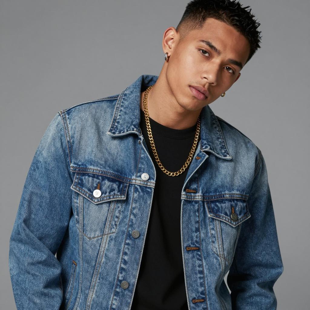 A young man poses confidently wearing a denim jacket over a black shirt, accessorized with layered gold chains and earrings. The style reflects contemporary urban fashion with a nod to hip-hop culture, highlighting individuality and streetwear influence.