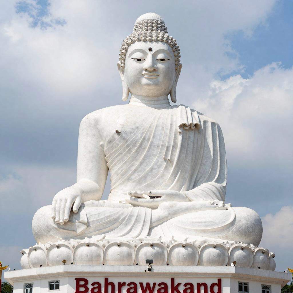 Photograph of a large, white, seated Buddha statue with a calm expression, set against a partly cloudy sky. The statue is detailed with subtle folds in the robes and has a serene, majestic presence. Below the Buddha, there's a white building with red Chinese characters and a few small windows. The name "Bahrawakand" is visible at the bottom.