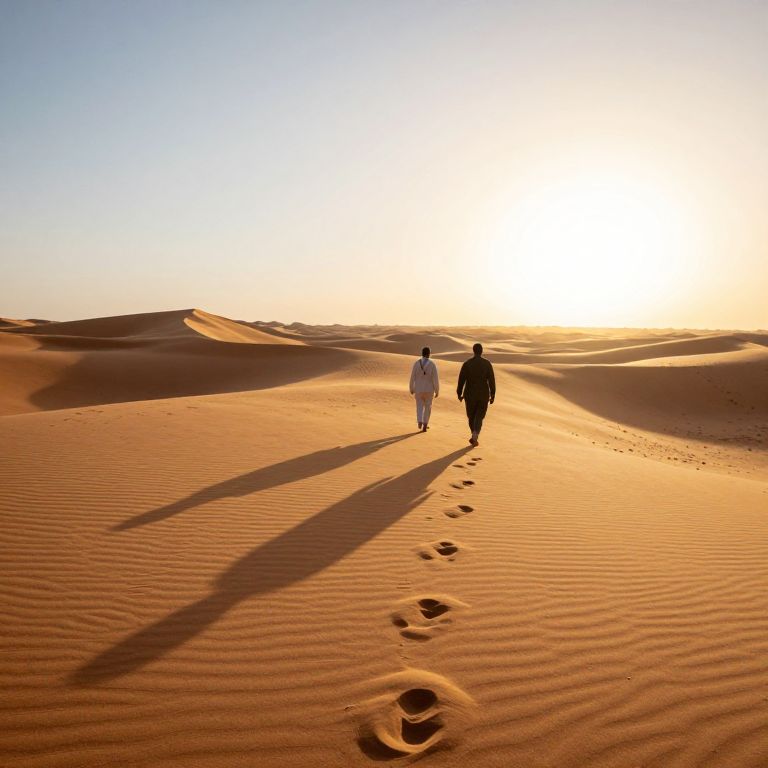 Photograph of two silhouetted figures walking side-by-side through a vast desert with golden-orange sand dunes under a bright, setting sun. The figures, one in a white robe and the other in a black outfit, cast long shadows on the rippled sand. Their footprints trail behind them, leading towards the horizon. The sky is clear with a gradient from blue to yellow near the sun. The scene evokes a sense of tranquility and solitude.