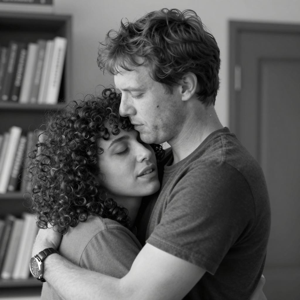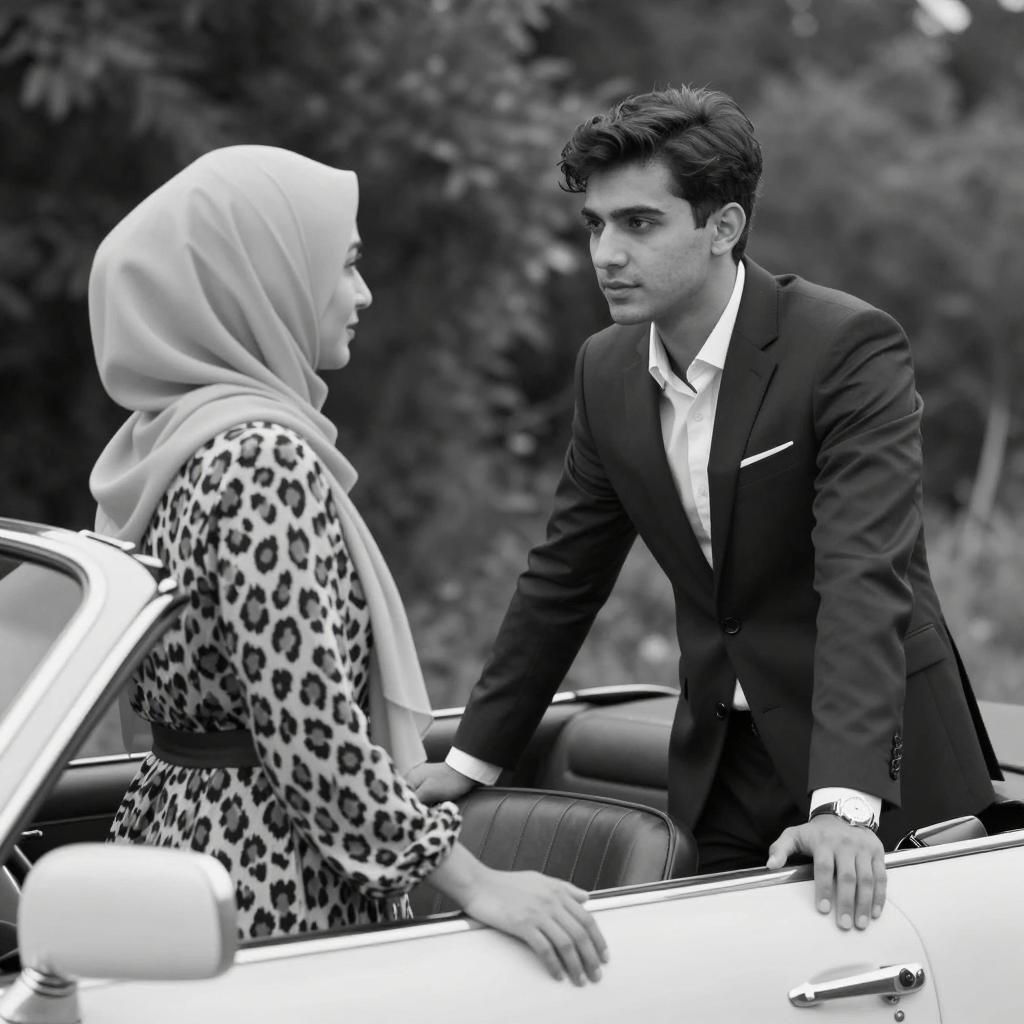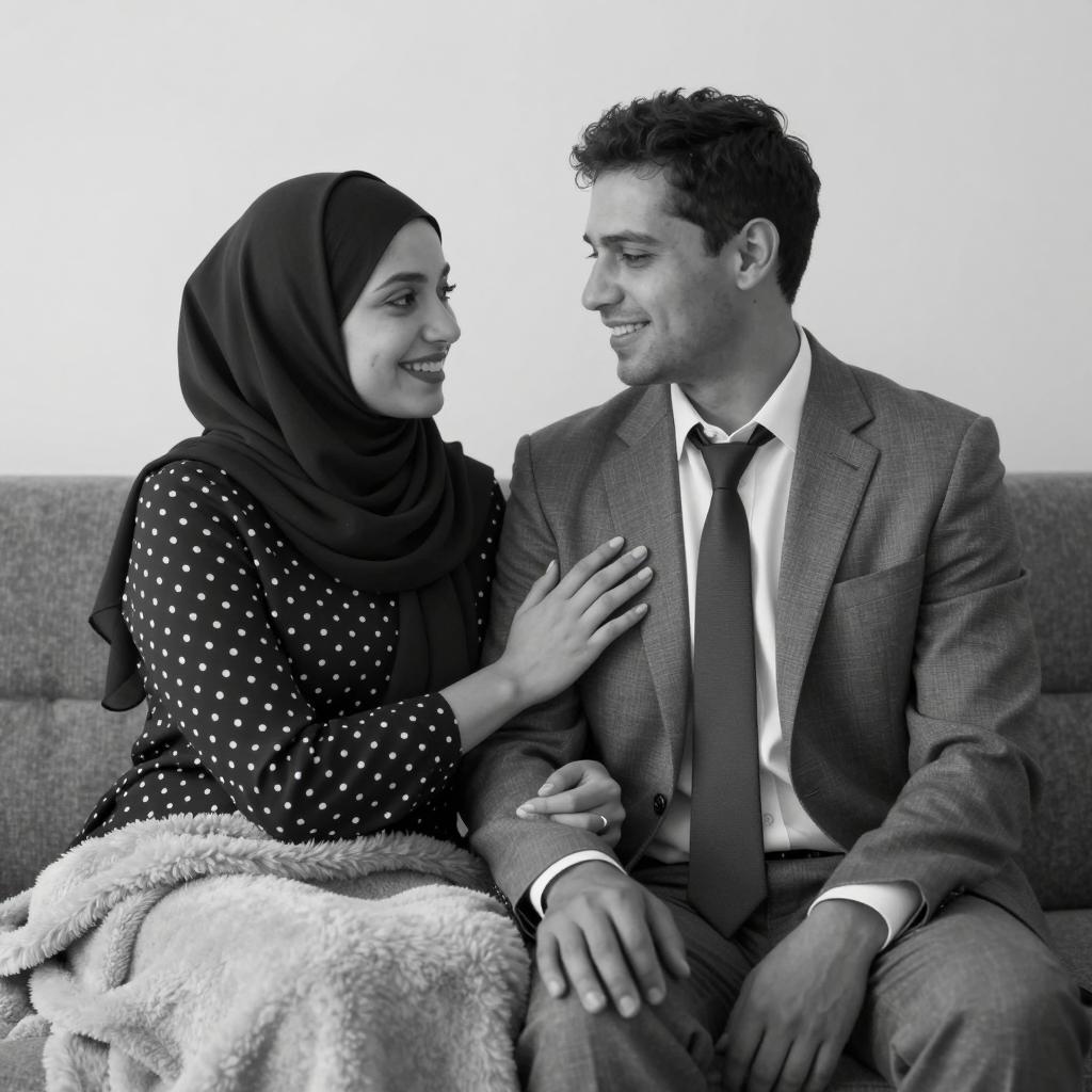 Black-and-white photograph of a man and woman sitting closely on a couch. Woman with dark headscarf, polka-dot dress, hand on man's chest, smiling. Man in ured suit, tie, short hair, smiling back. Both look affectionate. Fur blanket covers their laps. Soft light from above.