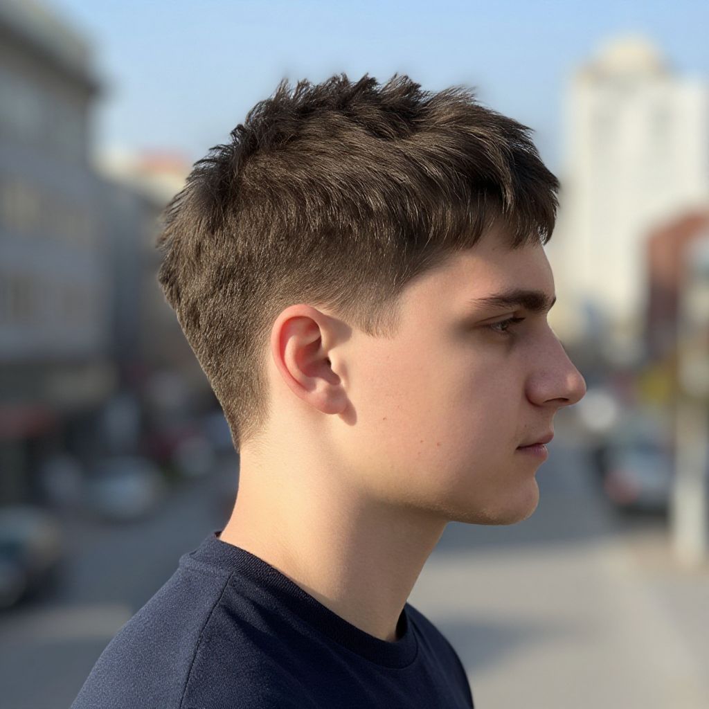 Short Edgar Cut, fit european man, contemporary hairstyle, realistic photography, cityscape background, natural sunlight, urban chic, professional hair detail, high clarity