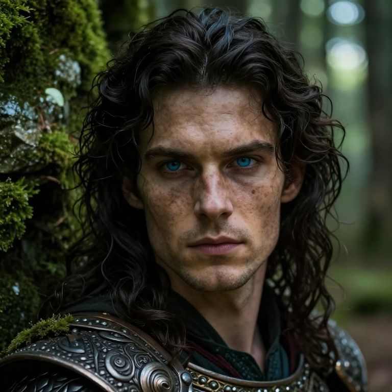 An enigmatic male figure with piercing blue eyes and defined cheekbones emerges from a mystical forest in this intricate close-up portrait. His wavy dark hair seamlessly merges with the mossy stone wall behind him, embodying the essence of a woodland spirit. The interplay of light filtering through dense foliage creates an enchanting atmosphere, drawing attention to his subtle wrinkles and freckles on antique skin while accentuating the intricate patterns of his ancient armor-like attire.