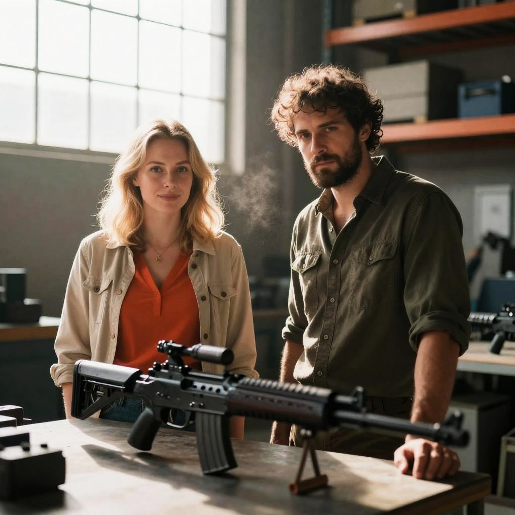 Photograph of two men with intense expressions, one with curly hair and beard, one with short hair and glasses, aiming a large sniper rifle. Desert background, wooden canopy above. Right man laughs, left man focuses through scope.