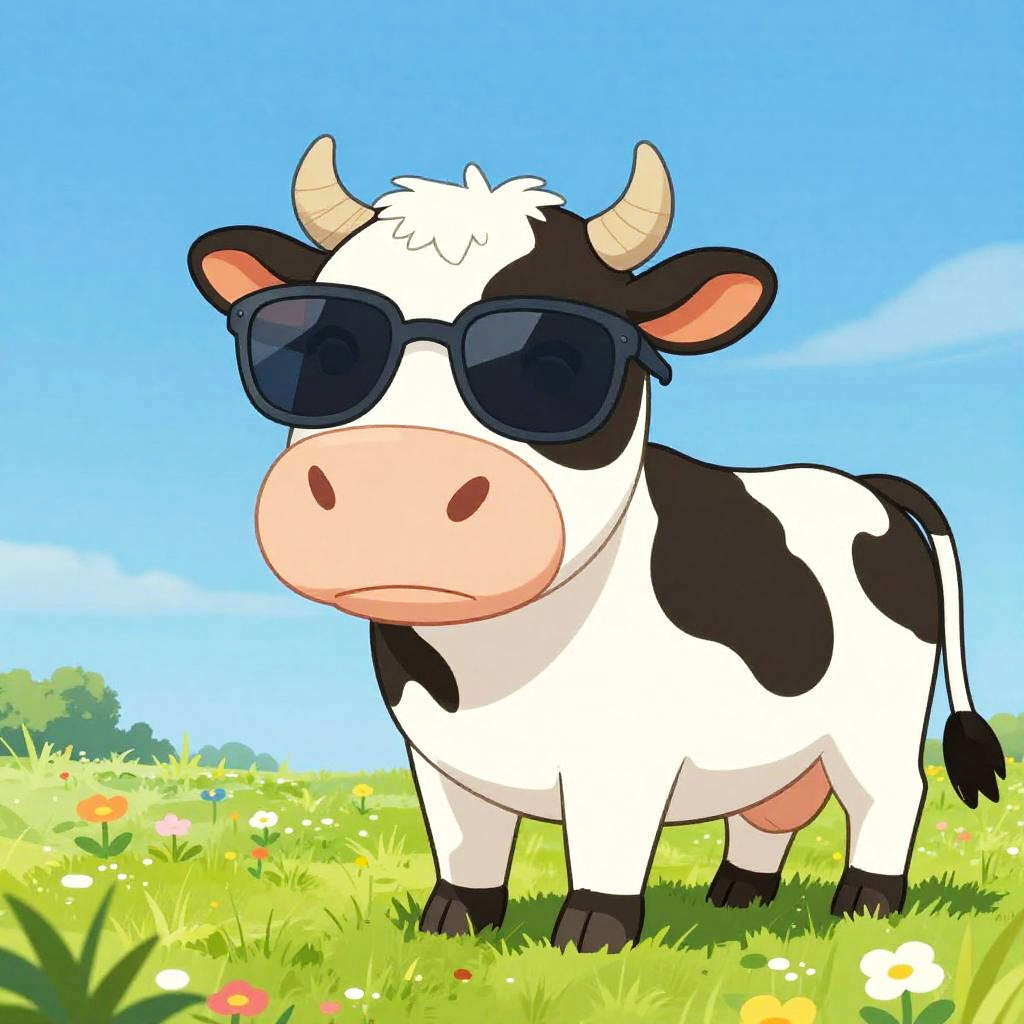 Cow with sunglasses standing in a sunny field, vibrant colors, cartoon style, playful and cool vibe, clear blue sky in the background, detailed grass and flowers