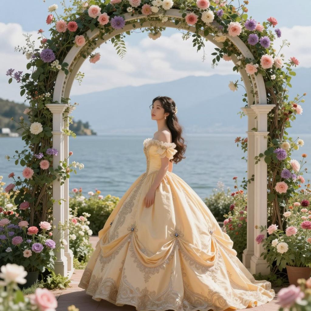 A beautiful young woman in an elegant ornate yellow ball gown with intricate patterns, standing in a lush garden archway filled with blooming pink and purple flowers, overlooking a serene blue lake with distant mountains under a bright sky, soft natural lighting, romantic fantasy style