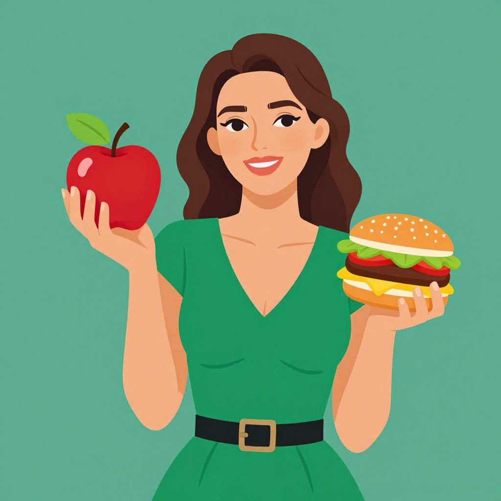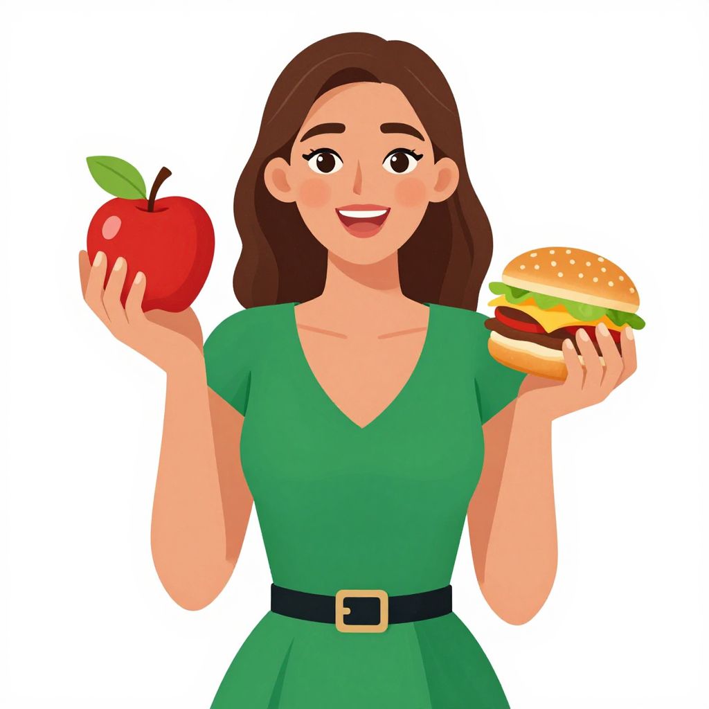 Illustration depicts a smiling Caucasian woman in a green dress, holding a vibrant red apple with a green leaf in her left hand and a golden-brown cheeseburger topped with lettuce and tomato in her right hand, symbolizing the choice between healthy and unhealthy food options.