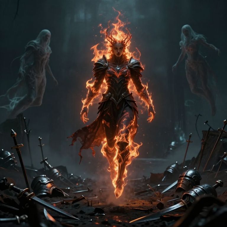 Azazael, a spectral entity wreathed in shadow flames, hovering over a desolate battlefield strewn with broken weapons and scattered armor, ghostly apparitions drifting in the background, haunting and surreal dark fantasy composition