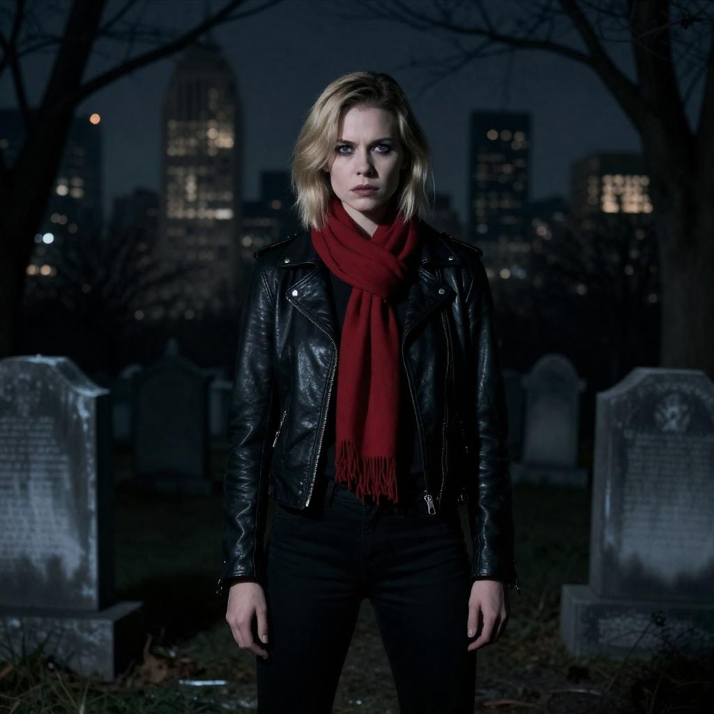 Woman with short blonde hair, black leather jacket, red scarf, and black pants, standing in a dark, eerie cemetery at night. Background: city skyline, tall buildings, dark sky. Gravestones and tree branches surround her. Intense, serious expression.
